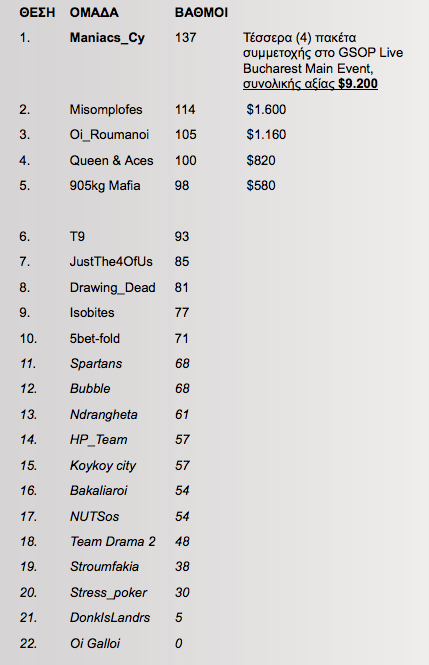Πολλά συγχαρητήρια στην ομάδα «Maniacs_Cy» που κερδίζει 4 πακέτα αξίας $9.200 συνολικά ($2.300 το άτομο) για τη συμμετοχή τους στο GSOP Live, Bucharest Main Event!