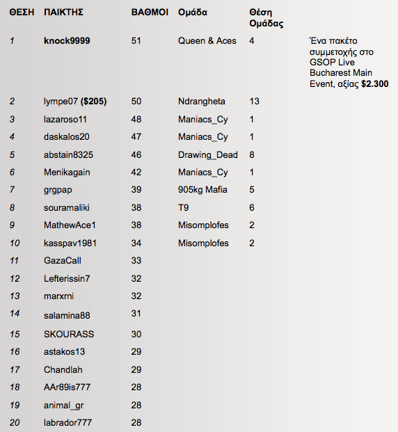 Στην βαθμολογία των παικτών, ο knock9999 της ομάδας Queen & Aces κατάφερε να κάνει την μεγάλη ανατροπή και να σκαρφαλώσει από την πέμπτη θέση στην πρώτη, με έναν μόλις βαθμό διαφοράς, από τον δεύτερο lympe07! Έτσι, ο knock9999 κερδίζει και αυτός ένα πακέτο συμμετοχής στο GSOP Live Bucharest Main Event, αξίας $2.300!