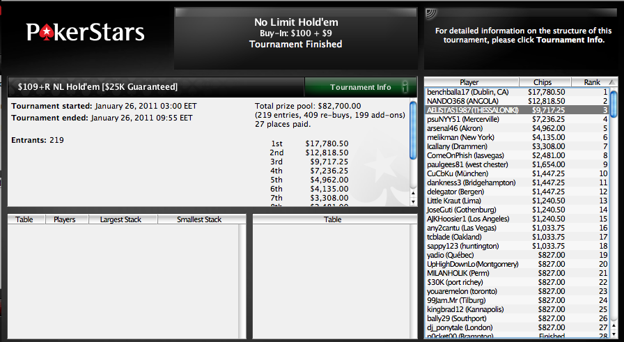 Δύο ημέρες αργότερα ωστόσο φρόντισε να διπλασιάσει τις επιτυχίες του συμμετέχοντας αυτή τη φορά σε τουρνουά $100+9 R/A NL Hold’em του PokerStars. 219 παίκτες δήλωσαν συμμετοχή και μαζί με 409 re-buys και 199 add-ons ανέβασαν το συνολικό prize pool στα $82.700! Ακόμη ένα deep run (3η θέση) για τον ‘AELISTAS1987’ του απέφερε το έπαθλο των $9.717 δείχνοντας ότι βρίσκεται σε εξαιρετική φόρμα το τελευταίο διάστημα.