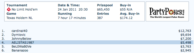 Ο ‘AELISTAS1987’ συμμετείχε αρχικά στις 24 Ιανουαρίου σ’ ένα $55 R/A NL Hold’ em τουρνουά που συγκέντρωσε ένα field 387 παικτών με το prize pool να ανέρχεται σε $65.240. Μετά από 7 ώρες περίπου η είσοδος του στο final table του τουρνουά επιβραβεύθηκε τελικά με την 4η θέση που του απέφερε συνολικά $5.498.