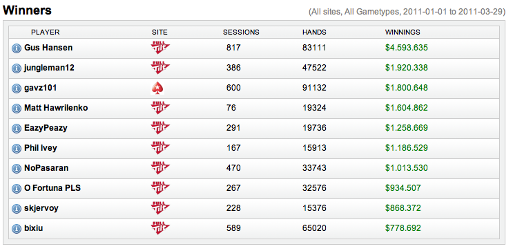 Το τοπ 10 των κερδισμένων στα high stakes το 2011