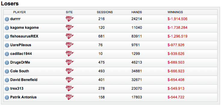 Regulars όπως ο "kagome kagome", ο "FishosaurusREX", ο "cadillac1944", ο "DrugsOrMe" και ο Κόουλ Σάουθ πασχίζουν να ξεφύγουν από το… κόκκινο, με τον Πάτρικ Αντόνιους μάλιστα να έχει απώλειες κοντά στα $500.000.