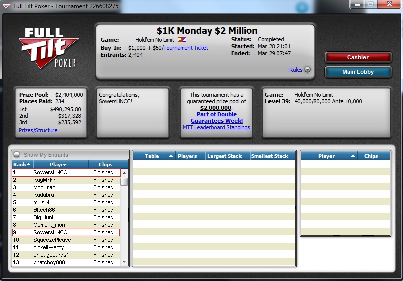 Το ενδιαφέρον της υπόθεσης ωστόσο είναι πως ο Μάïκ "SowersUNCC" Σάουερς (φωτό επάνω) – 5ος στο 2011 PCA – κατέστη ο πρώτος παίκτης που καταφέρνει να μπει με δύο συμμετοχές (με την δυνατότητα του multi-entry tournament) σε final table!