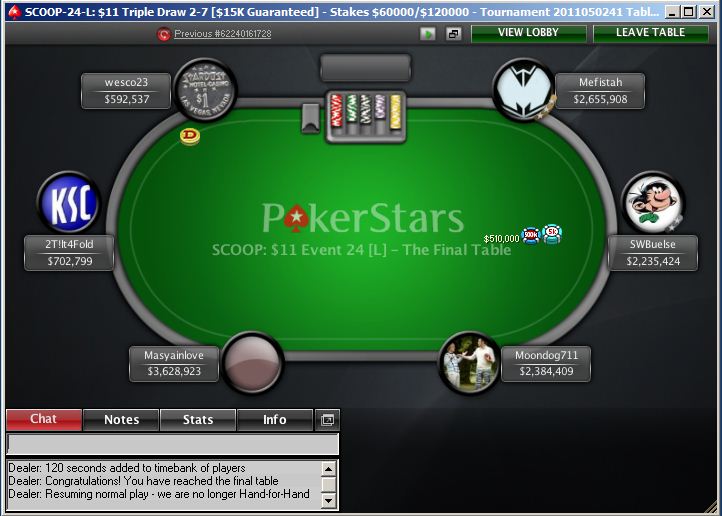 Ο λόγος για την επιτυχία του “Mefistah”. Ο Έλληνας παίκτης έλαβε μέρος στο SCOOP-24-L $11 Triple Draw 2-7 Event, επιλέγοντας έτσι να διαγωνισθεί με ακόμα 2.439 παίκτες σε μία άκρως ασυνήθιστη παραλλαγή του πόκερ! Το γεγονός αυτό όμως δεν εμπόδισε τον Έλληνα παίκτη να “σκαρφαλώσει” μέχρι την 4η θέση του τουρνουά, έπειτα από σχεδόν 11 ώρες παιχνιδιού, και να κερδίσει έτσι χρηματικό έπαθλο κατά 122 φορές μεγαλύτερο του αρχικού του buy-in – $1.342.