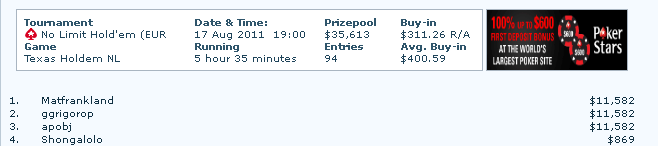 94 παίκτες μονομάχησαν συνολικά στην πλατφόρμα του PokerStars για τις 3 θέσεις που οδηγούν στο EPT Barcelona (27 Αυγούστου-1 Σεπτεμβρίου) και ο ggrigorop -νικητής του πρώτου Greek Poker Cup στο Λουτράκι- μαζί με τον Κύπριο apobj κατάφεραν να πλασαριστούν εντός της τριάδας.