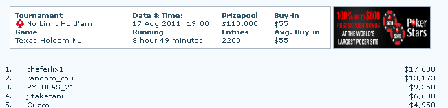 Πολύ κοντά τώρα σε πενταψήφιο έπαθλο έφτασε και ο PYTHEAS_21 που έλαβε μέρος σ’ ένα $55 NL Hold’ em, με τους 2.200 συμμετέχοντες να συνθέτουν το prize pool των $110.000!