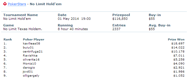 Ο ‘kavlleas08’ κατέστη ο απόλυτος κυρίαρχος του Big $55 και εισέπραξε το χρηματικό έπαθλο των $18.697!! Το συγκεκριμένο cash είναι το δεύτερο μεγαλύτερο της καριέρας του, καθώς δύο μήνες πριν ο Έλληνας παίκτης είχε ‘σηκώσει’ το Big $109 για $19.858!!