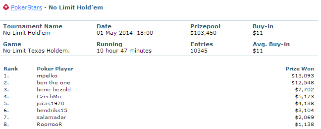 Νικητής στην heads-up αναμέτρηση του Big $11 αναδείχθηκε ο ‘mpelko’ που κέρδισε μετά από deal με τον Γερμανό αντίπαλο του το ποσό των $13.093! Αξίζει να σημειωθεί πως ο ‘mpelko’ είχε μόλις $51 σε κέρδη μέχρι πρότινος και 86 συμμετοχές σε τουρνουά της εν λόγω πλατφόρμας!