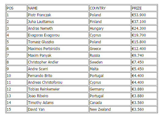 Συνολικά 15 παίκτες πλασαρίστηκαν εντός επάθλων, με τον Πολωνό Piotr Franczak να φτάνει στην κορυφή.