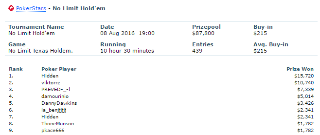 Ο ‘damourinio’ αποκλείστηκε στην 4η θέση του $215 Monday 6-max κερδίζοντας $5.014.