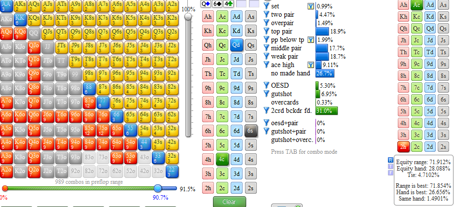 Ακόμη κι αν αποκλείσουμε τις μπλόφες και υποθέσουμε πως ο McKeehen ποντάρει με όλα τα συμπληρωμένα hands του και αρκετά αδύναμα Ax, το Α-2 off του Kenney έχει 28% equity. Ποσοστό αρκετό για το check/call.