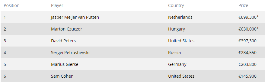 Ο van Putten ξεκίνησε στην Day 1b αλλά λόγω μιας αδιαθεσίας έφυγε στην μέση της ημέρας κι έμεινε με λίγα blinds στην έναρξη της Day 2. Αυτό δεν τον εμπόδισε ωστόσο να φτάσει μέχρι το final table και να κερδίσει χθες τον πολυπόθητο τίτλο και το έπαθλο των €699.300!