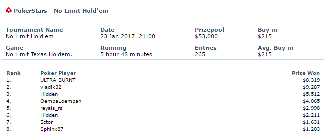 Δύο Έλληνες παίκτες βρέθηκαν χθες στις κορυφαίες θέσεις του Big $215, με τον Παύλο ‘ULTRA–BURNT’ Κ. να κερδίζει στο heads-up τον ‘vladik32’. Είχε προηγηθεί νωρίτερα deal κι έτσι ο νικητής εξασφάλισε $8.319 και ο αντίπαλος του $9.287.