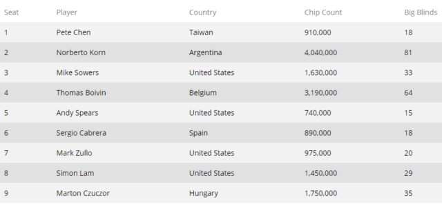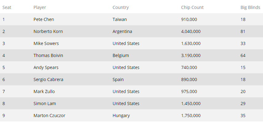 Εννέα παίκτες από έξι διαφορετικές χώρες συγκροτούν το τελικό τραπέζι στο οποίο ηγείται ο Αργεντίνος Norberto Korn.