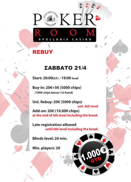 Σάββατο 21 Απριλίου – €25 NLHE (€1.000gtd)