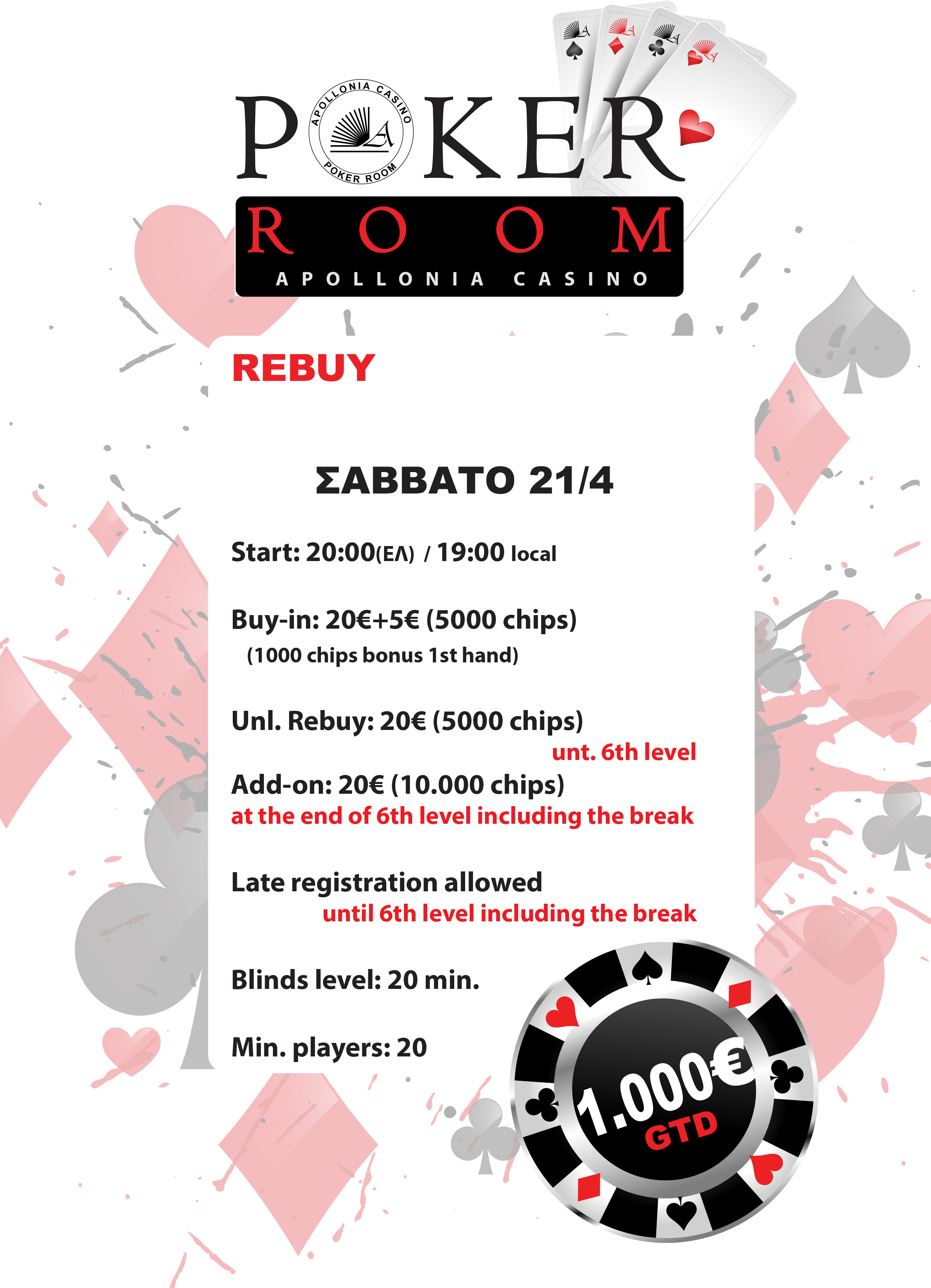 Εγγραφές και απεριόριστα rebuys με €20 (5.000 chips) για τα πρώτα 6 levels