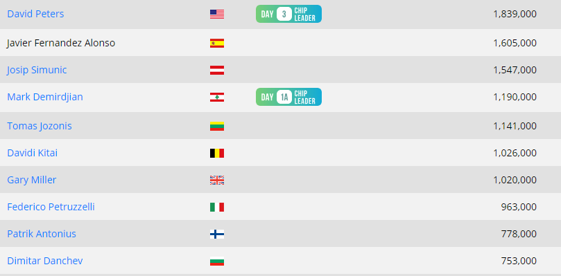 Για δεύτερη συνεχόμενη μέρα ο David Peters κρατάει τα ηνία στο chip count με 1.839.000 μάρκες.