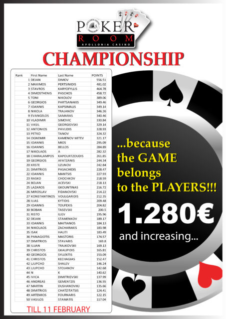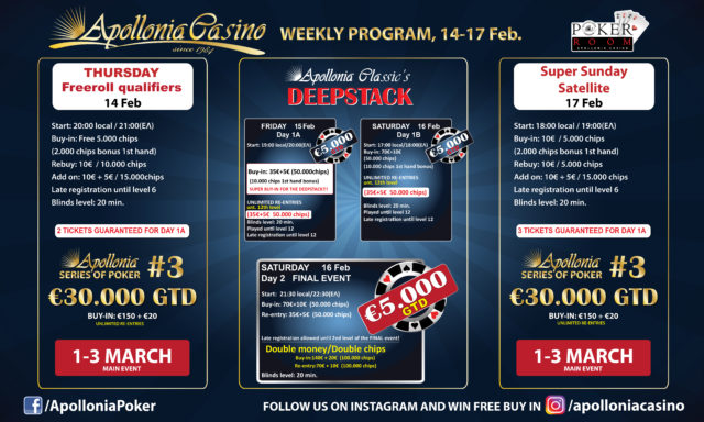 Με το καθιερωμένο τετραήμερο πρόγραμμα συνεχίζεται και αυτή την εβδομάδα η δράση στην αίθουσα πόκερ του Apollonia!
