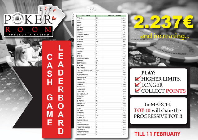 Βαθμολογία φυσικά ‘τρέχει’ και για τα cash games, με τους δέκα κορυφαίους παίκτες να μοιράζονται το progressive pot τον Μάρτιο.