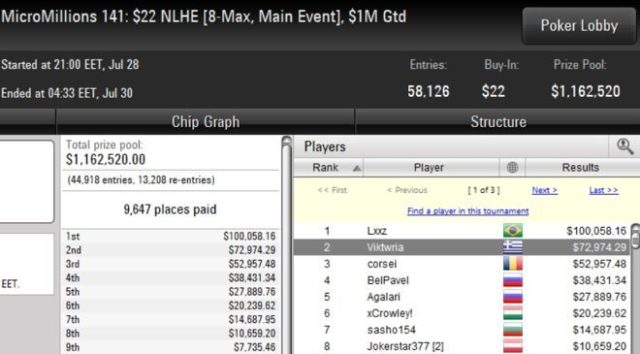 Νικητής του MicroMillions main event τον περασμένο Ιούλιο είχε αναδειχθεί ο Βραζιλιάνος ‘Lxxz’ που μετέτρεψε μόλις $22 σε $100.058 κερδίζοντας στο heads-up Έλληνα αντίπαλο (‘Viktwria’).
