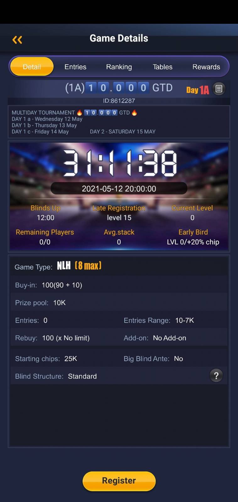Οι παίκτες θα έχουν τρία flights στη Day 1 για να καταφέρουν να προκριθούν στη Day 2 η οποία θα πραγματοποιηθεί το Σάββατο 15 Μαΐου στις 18:00.