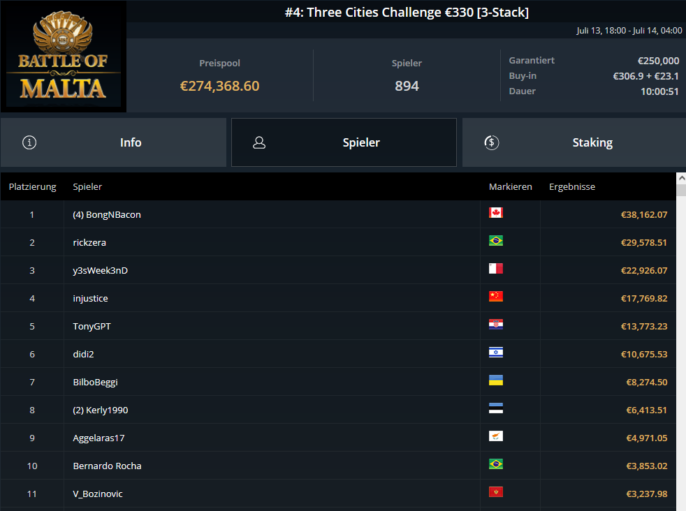 Στην 9η θέση του Battle of Malta #4 (€330 NLHE 3-stack) τερμάτισε ο ‘Aggelaras17’ για €4.971.