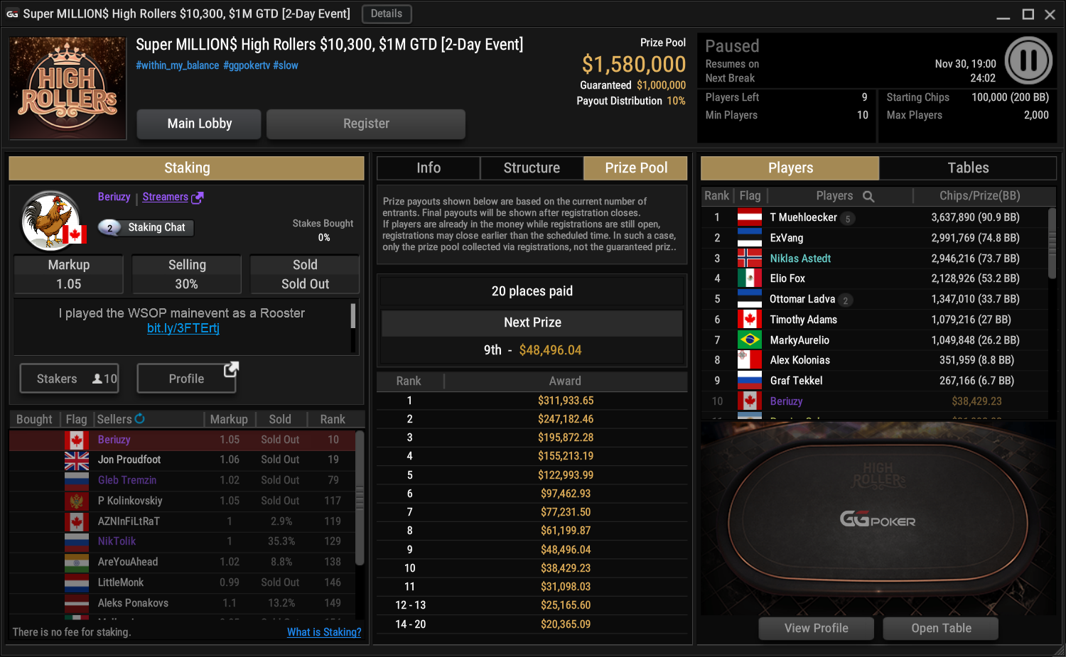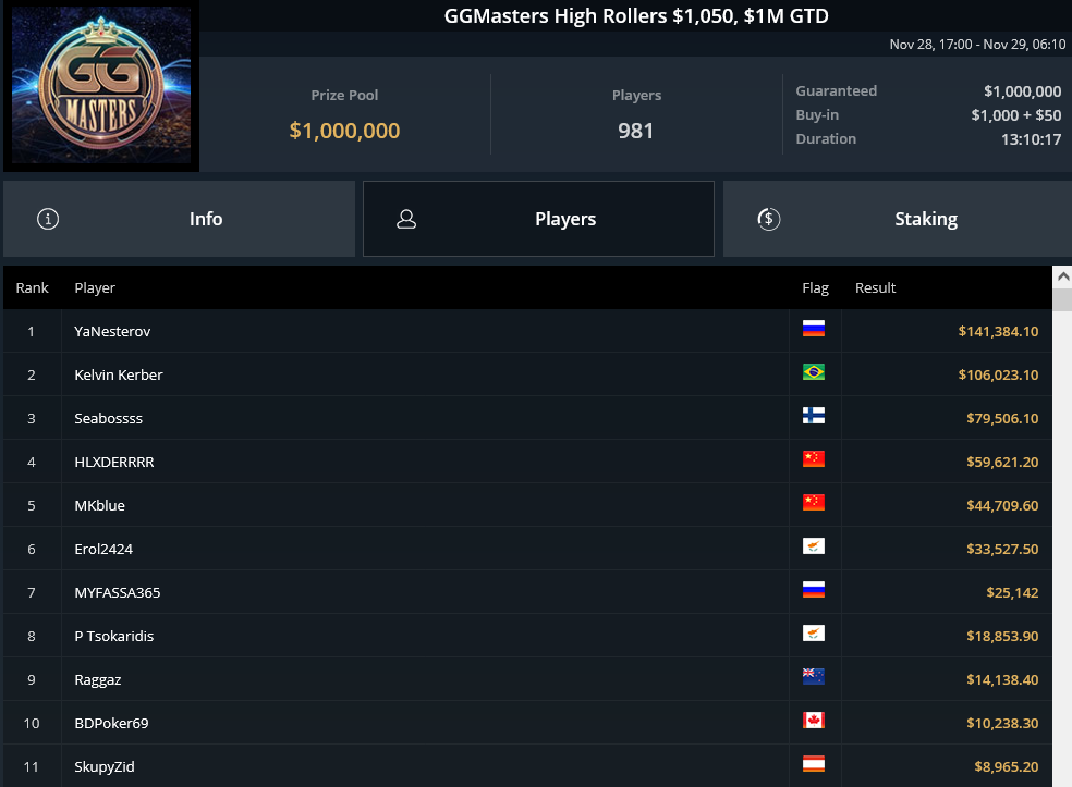 Στην 8η θέση του $1.050 GGMasters τερμάτισε εξάλλου ο Πάρης Τσοκαρίδης για $18.854!