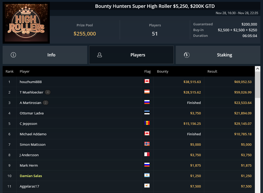 Στην 11η θέση του $5.250 Bounty Hunters αποκλείστηκε τέλος ο ‘Aggelaras17’ για $7.500.