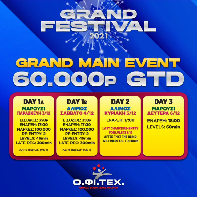 Το πολύ-αναμενόμενο 350p main event του Grand Festival (60.000p gtd) ξεκινάει σήμερα με πρώτη στάση στο ‘παλάτι’ του Αμαρουσίου!