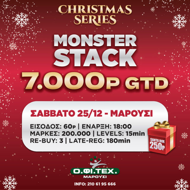 Η χριστουγεννιάτικη σειρά του Ο.ΦΙ.ΤΕΧ. συνεχίζεται με το Monsterstack στο Μαρούσι να ‘χαρίζει’ τουλάχιστον 7.000p! Όσοι επιλέξουν το venue του Πειραιά θα τεστάρουν τις δεξιότητες τους στο Mini Deeptack!