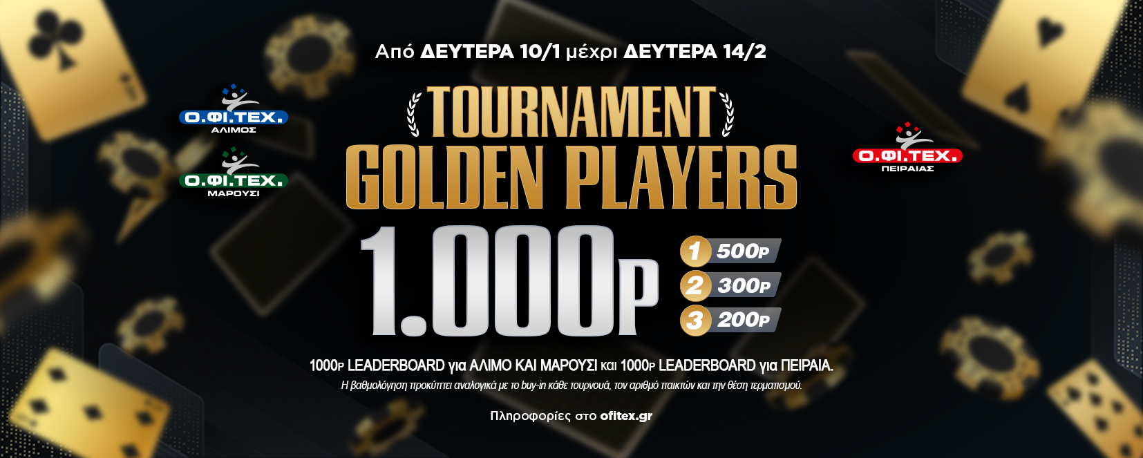 Από σήμερα εξάλλου έως την Δευτέρα 14 Φεβρουαρίου θα ‘τρέχουν’ και δύο νέα leaderboards, ένα σε Άλιμο-Μαρούσι (1.000p gtd) κι ένα στον Πειραιά (1.000p gtd).