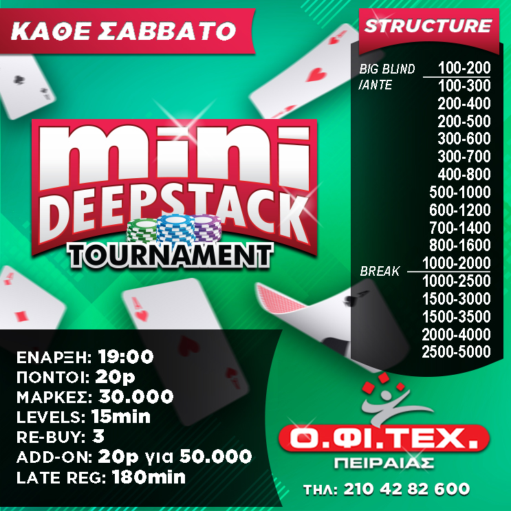 Blind levels: 20 λεπτά / 30 λεπτά μετά το διάλειμμα