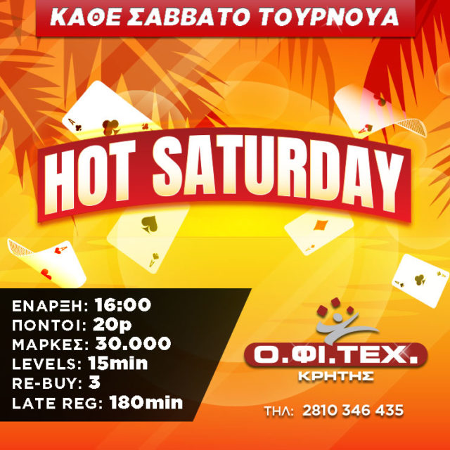 Το σαββατόβραδο στους συλλόγους Ο.ΦΙ.ΤΕΧ. η δράση… πιάνει κόκκινο με Royal στο παλάτι των Βορείων Προαστίων, Mini Deepstack στην αίθουσα του Πειραιά και Hot Saturday στον σύλλογο της Κρήτης!