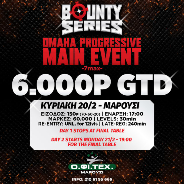 Στους λάτρεις της παραλλαγής Omaha απευθύνεται σήμερα το event της Bounty Series με το διήμερο main event να μοιράζει τουλάχιστον 6.000p στο Μαρούσι!