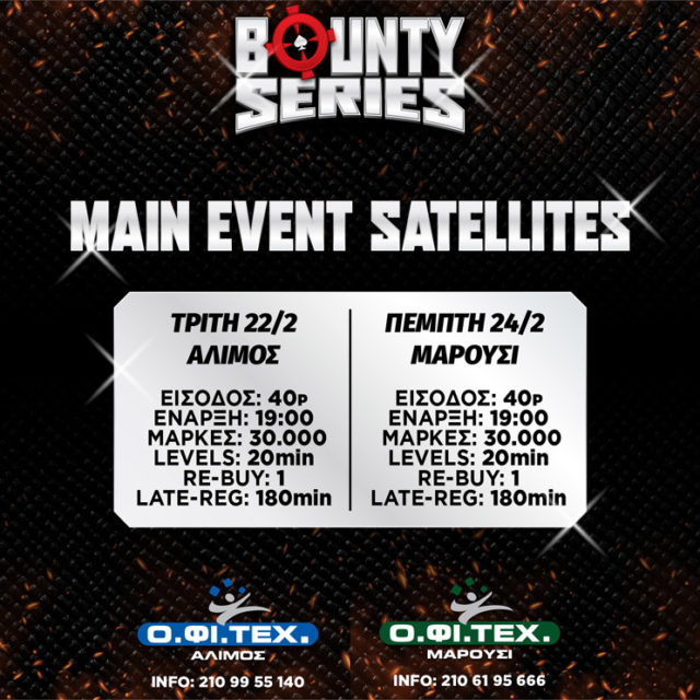 Την ευκαιρία να εξασφαλίσετε από τώρα την συμμετοχή σας στο main event (45.000p gtd) της Bounty Series σας δίνει σήμερα ο προκριματικός του Αλίμου, ενώ αντίστοιχο satellite θα λάβει χώρα και την Πέμπτη στο Μαρούσι!