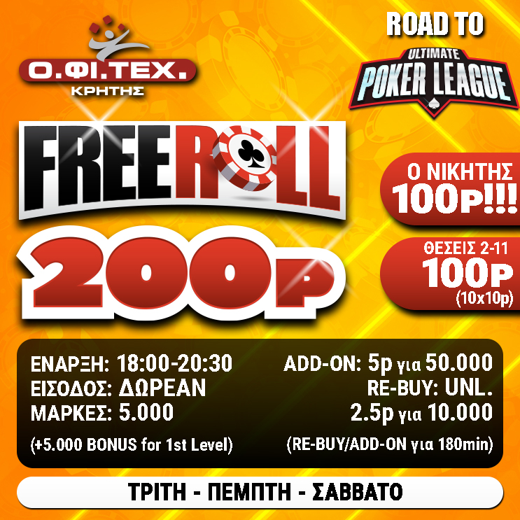 και το freeroll (200p gtd) & Road to Ultimate Poker League στο Ηράκλειο