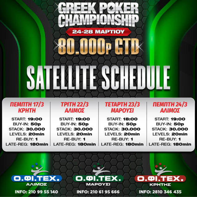 Το Greek Poker Championship απέχει μόλις δύο ημέρες και όσοι ‘βουτήξουν’ στο αποψινό satellite του Αλίμου έχουν την ευκαιρία να εξασφαλίσουν από τώρα την είσοδο τους στο 350p main event (80.000p gtd).