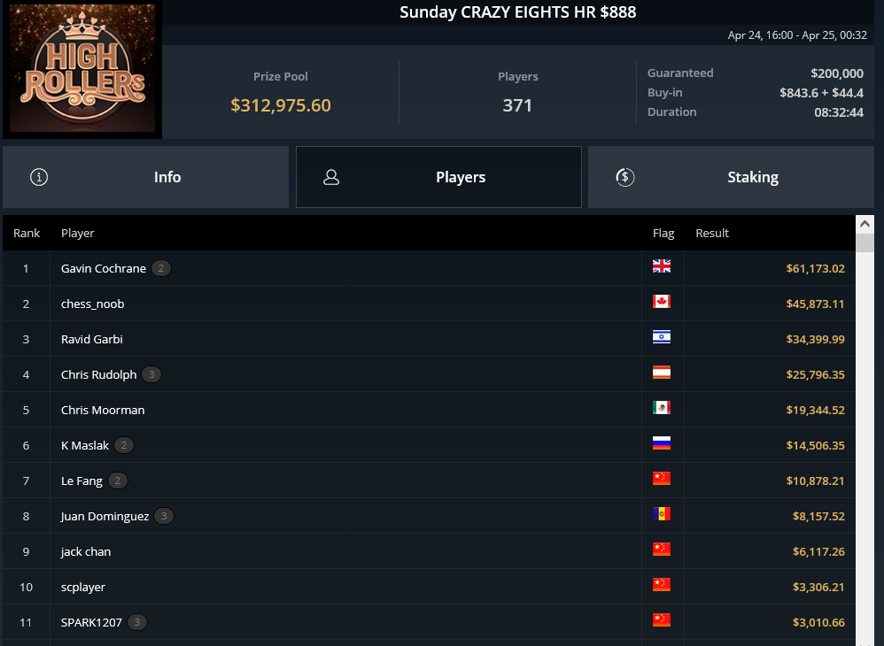 Χατ-τρικ για τον Άλκη Σταμάτη που κατέλαβε την 7η θέση του $1.050 Sunday Cooldown για $4.925, την 15η θέση του $888 Crazy Eights για $2.496 και την 44η θέση του $50 Global Millions για $1.723.