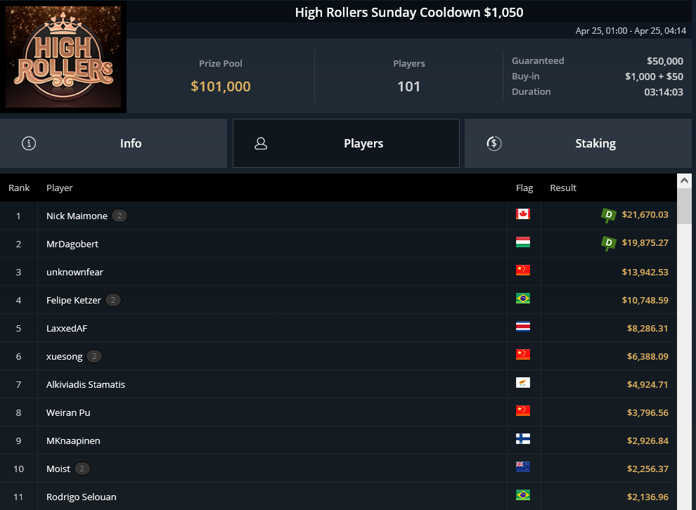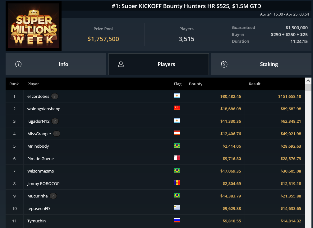 Στην 208η θέση τέλος του $525 Bounty Hunters αποκλείστηκε ο Δαμιανός ‘Thecleanerrr’ Ασλανίδης για $1.602, στην 251η θέση ο Δημήτρης Ασγουδάκης για $1.650 και στην 315η θέση ο Αλέξανδρος Κολώνιας για $1.207.