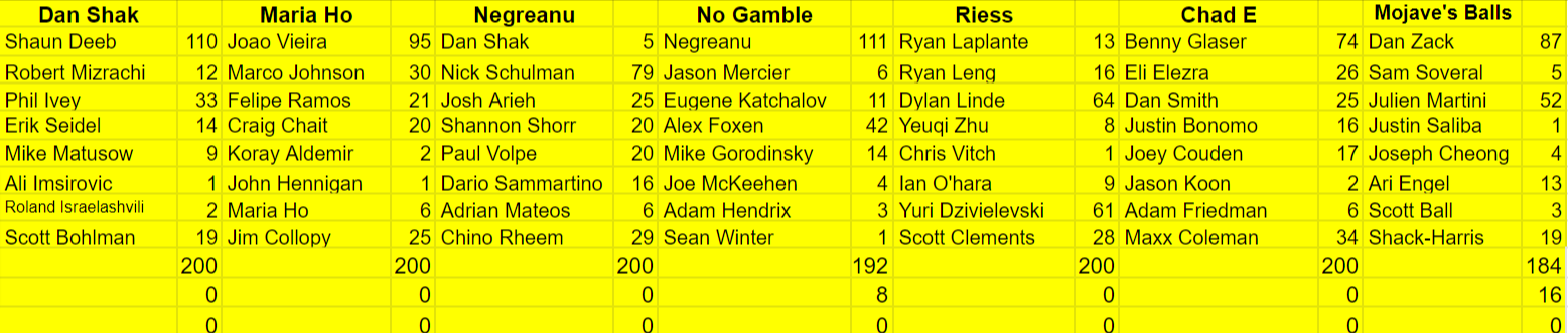 Όλοι οι παίκτες των fantasy drafts έχουν μια τιμή και οι οχτώ που θα επιλεγούν δεν πρέπει να υπερβαίνουν συνολικά τα $200. Κάποιοι μάλιστα που θα συμμετέχουν στα περισσότερα events του WSOP τιμώνται με $110 και $111 όπως οι Shaun Deeb και Daniel Negreanu.