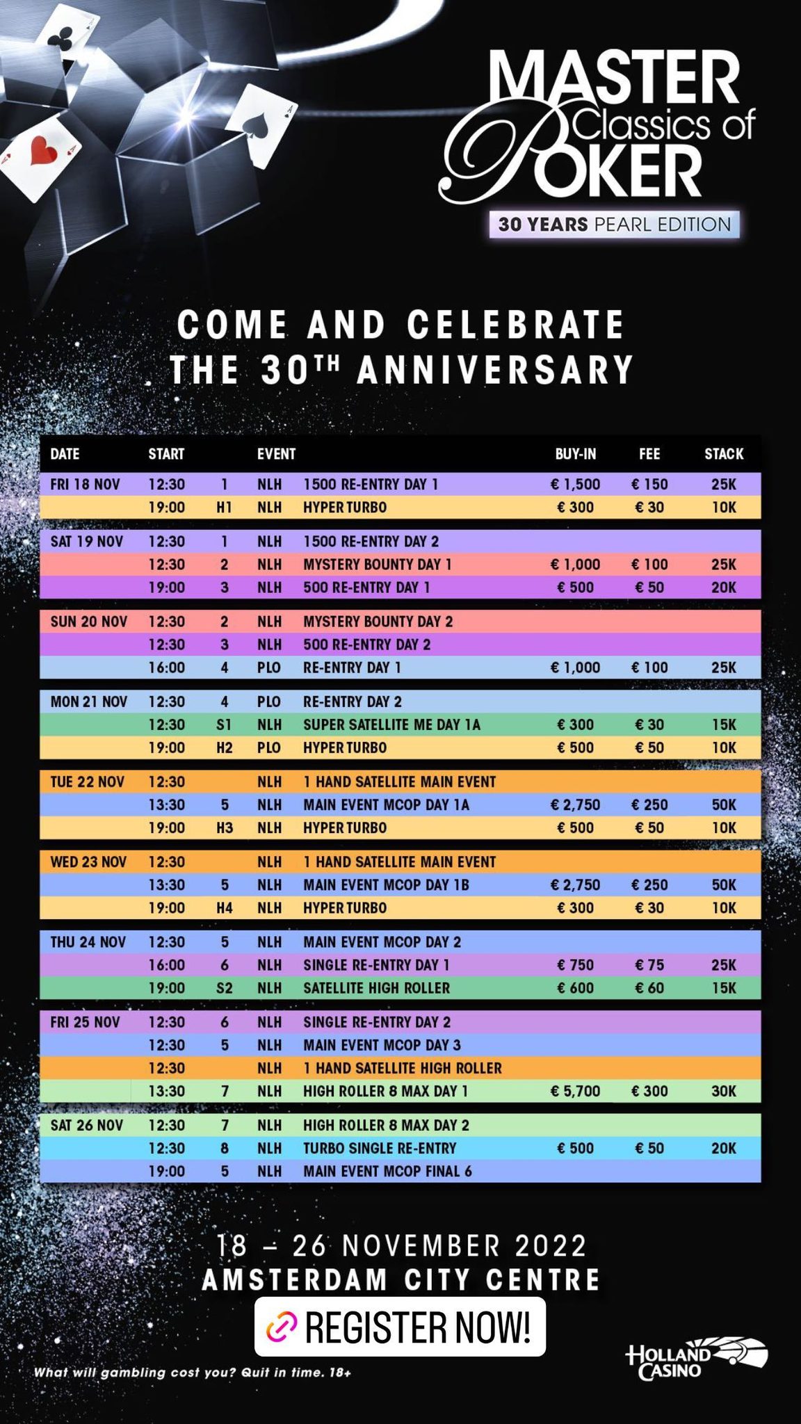 Το επετειακό Master Classics of Poker απ” την άλλη θα γιορτάσει τα 30 του χρόνια από 18 έως 26 Νοεμβρίου στο Amsterdam City Centre.