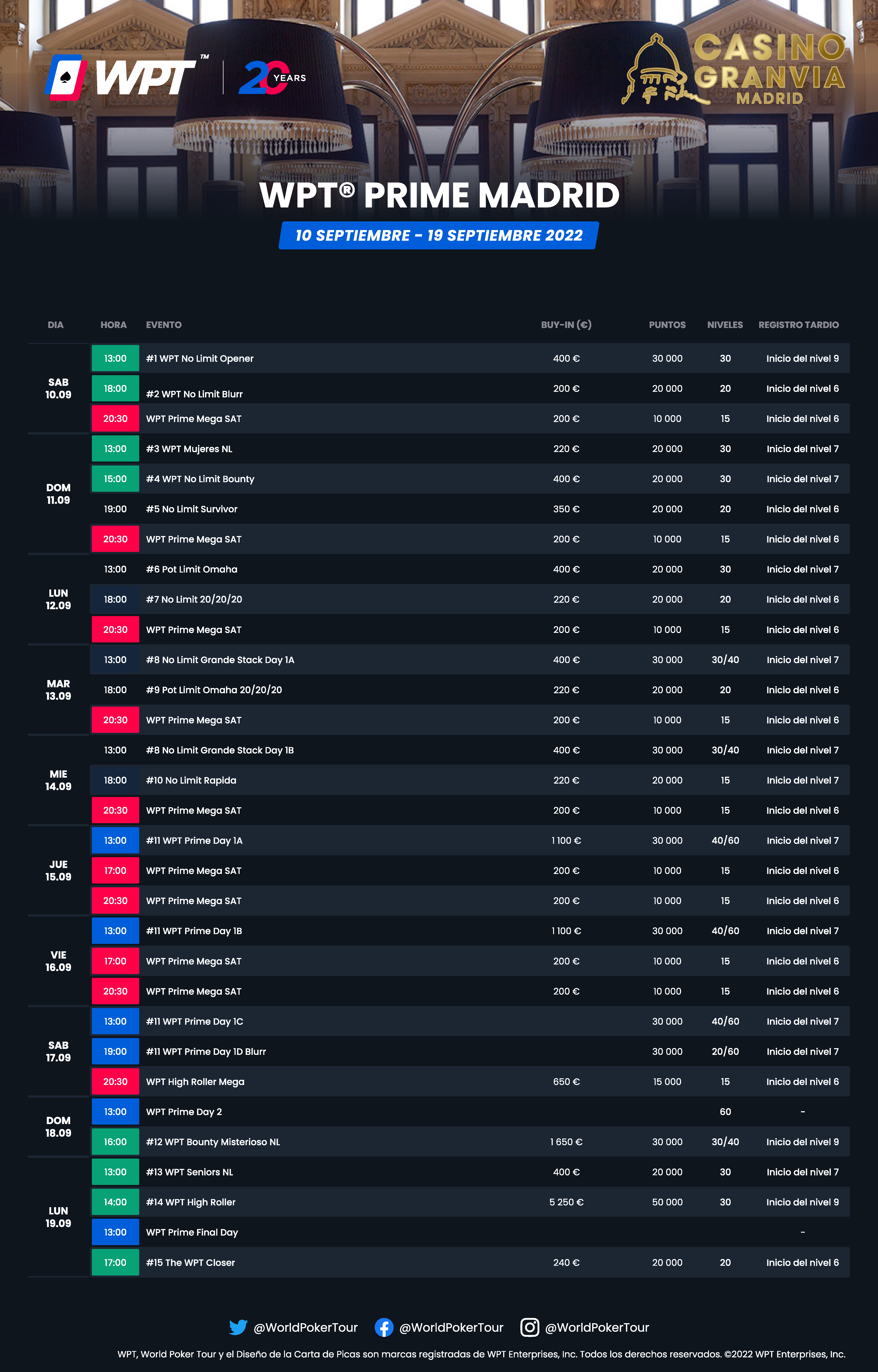 Αρχικά προηγείται το WPT Prime Madrid που θα λάβει χώρα από 10 έως 19 Σεπτεμβρίου.