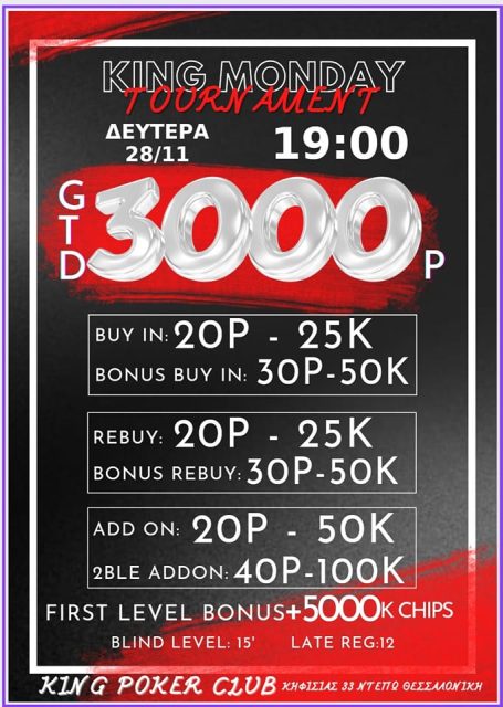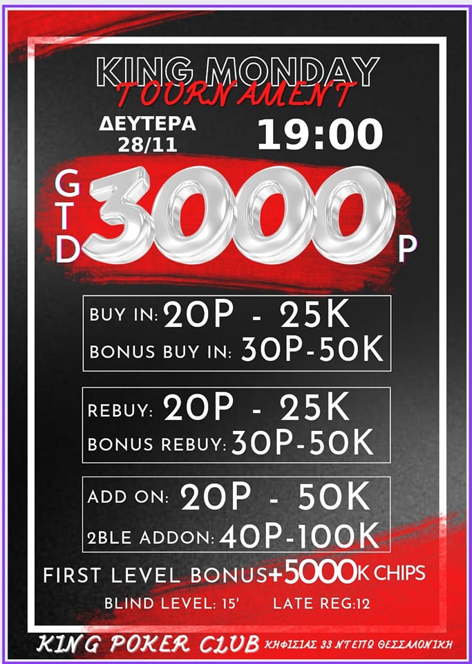 Σήμερα στις 19:00 σας περιμένει το καθιερωμένο King Monday με 3.000p gtd κι όσοι εγγραφούν μέσα στο πρώτο level εξασφαλίζουν επιπλέον 5.000 μάρκες!