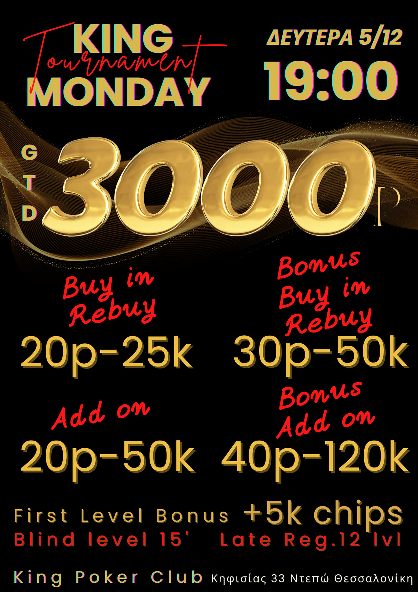 Σήμερα στις 19:00 σας περιμένει το καθιερωμένο King Monday με 3.000p gtd κι όσοι εγγραφούν μέσα στο πρώτο level εξασφαλίζουν επιπλέον 5.000 μάρκες!