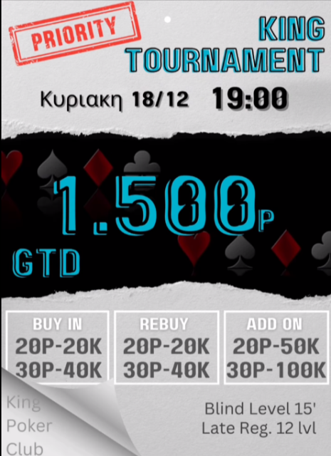 King: Στις 19:00 το 20p NLHE με 1.500p gtd!