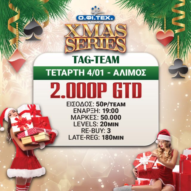 Στην τελική ευθεία έχει μπει η Xmas Tournament Series με το Tag-Team (2.000p gtd) να “τρέχει” απόψε στον Άλιμο και την σειρά να ρίχνει αυλαία με το πενθήμερο Ho-ho-hold’em tournament (25.000p gtd) που ξεκινάει αύριο.