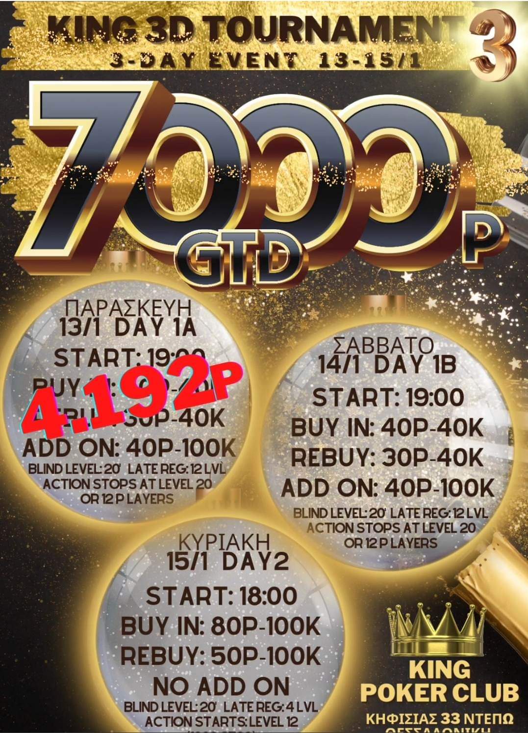 Σήμερα στις 19:00 θα λάβει η Day 1b του 40p King 3d (7.000p gtd) με απεριόριστα rebuys προς 30p και την δράση να ολοκληρώνεται είτε στο εικοστό level, είτε στους 12 παίκτες.