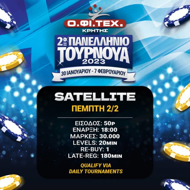 Δύο last chance satellites έχουν προγραμματιστεί απόψε σε Άλιμο και Κρήτη εν όψει της αυριανής πρεμιέρας του 2ου Πανελλήνιου τουρνουά που πρόκειται να μοιράσει τουλάχιστον 80.000p!
