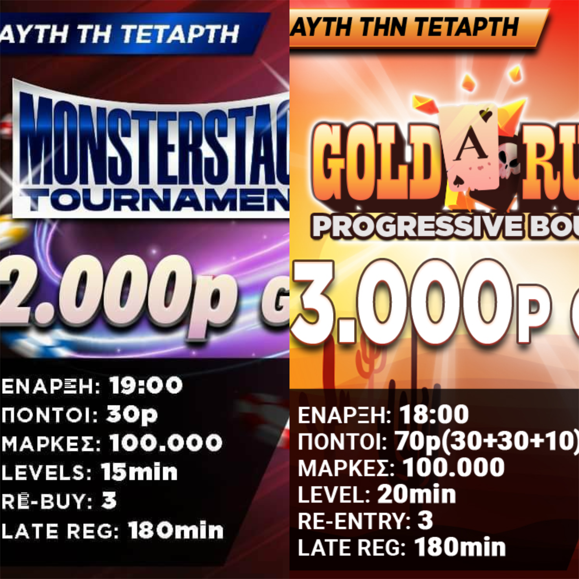 Mε 5.000p gtd θα διεξαχθούν δύο από τα αποψινά events (Monstestack & Gold Progressive), ενώ το bubble και στα δύο δεν θα μείνει… παραπονεμένο, καθώς θα λάβει 30p satellite ticket για την επερχόμενη Go for Gold Series!