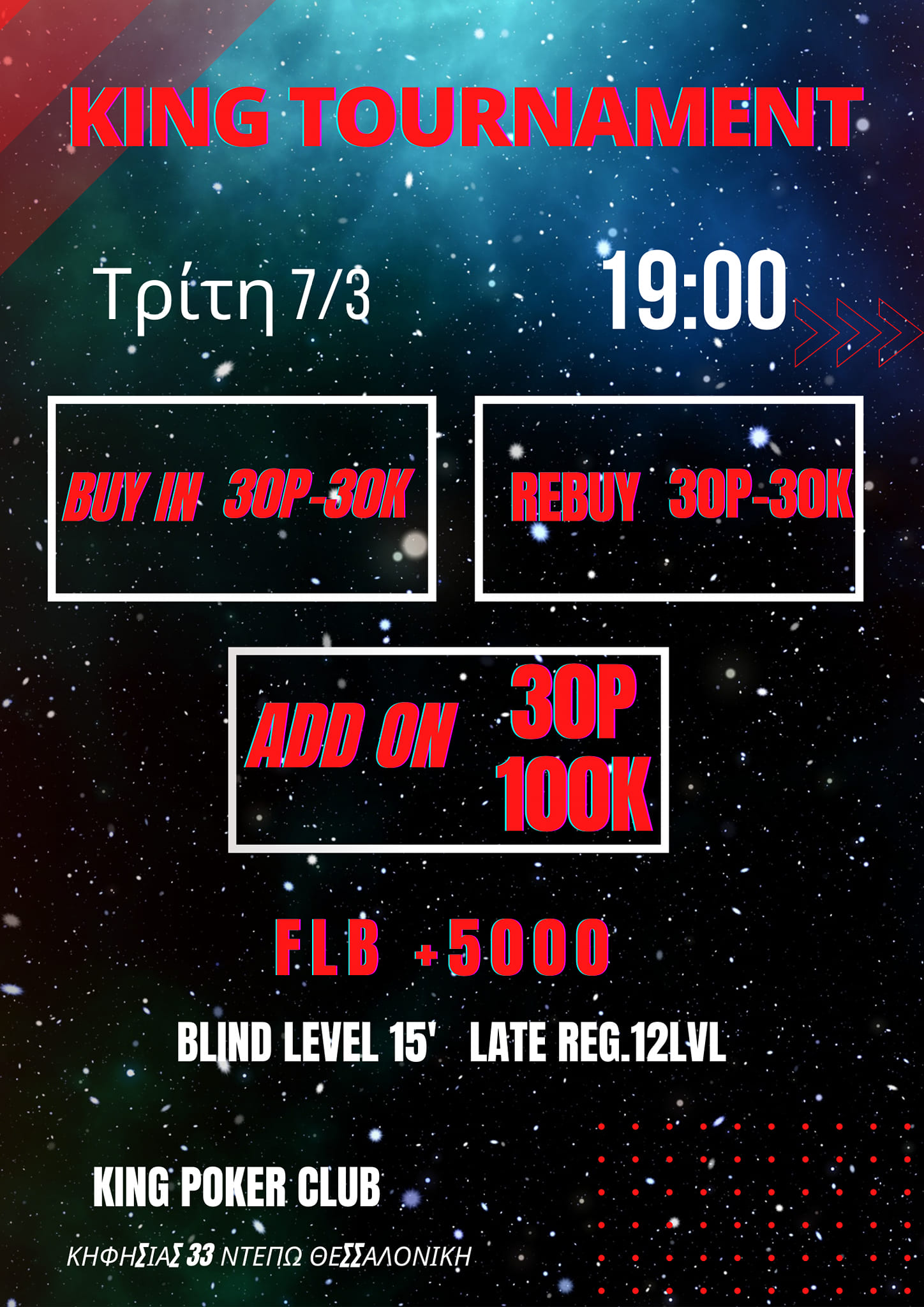 Δικαίωμα για καθυστερημένες εγγραφές και απεριόριστα rebuys (30p – 30.000 μάρκες) στα πρώτα 12 levels